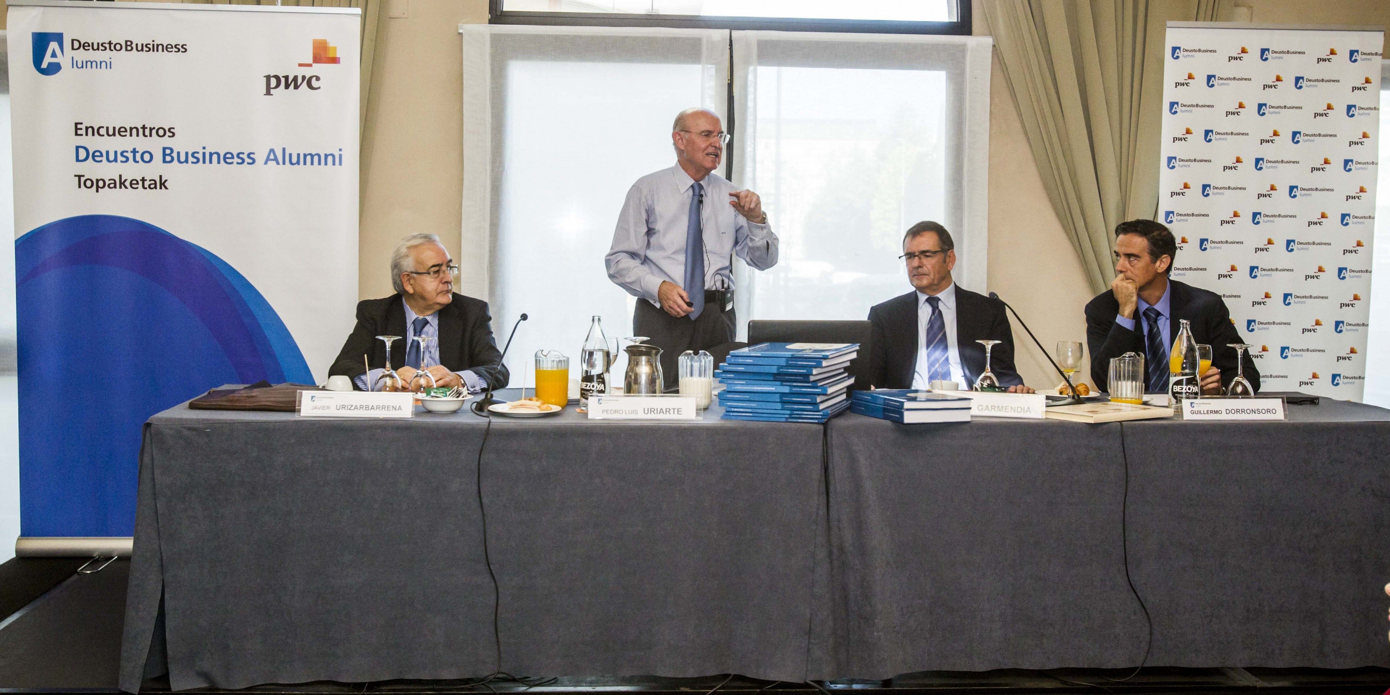 En el acto acompañando al ponente se encontraban Agustín Garmendia, presidente de Deusto Business Alumni, entidad organizadora del mismo, Guillermo Dorronsoro, decano de Deusto Business School y Javier Urizarbarrena, Socio-director de PwC en representación del sponsor del Encuentro.